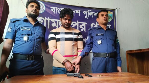 চাঁপাইনবাবগঞ্জের গোমস্তাপুর থেকে বিদেশী একটি অবৈধ পিস্তল, মাগজিন ও ৪ রাউন্ড গুলিসহ মধুমতি নামের এক এনজিও মালিক কে গ্রেফতার করেছে গোমস্তাপুর থানা পুলিশ। বৃহষ্পতিবার (১৭ নভেম্বর) দুপুরে উপজেলার চৌডালা (শহীদ বীর মুক্তিযোদ্ধা আস্তার রহমান) সেতুর টোল এলাকা থেকে গ্রেফতার করা হয়।