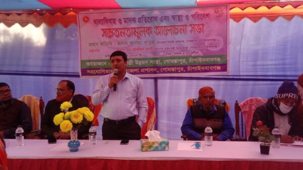 চাঁপাইনবাবগঞ্জের গোমস্তাপুরে বেসরকারি এনজিও সংস্থার উদ্যোগে বাল্য বিবাহ ও মাদক প্রতিরোধ এবং স্বাস্থ্য ও পরিবেশ বিষয়ে এক সচেতনতামূলক সভার আয়োজন করা হয়। সোমবার বিকেলে মাইস পল্লী উন্নয়ন সংস্থার আয়োজনে ও গোমস্তাপুর উপজেলা প্রশাসনের সহযোগিতায় গোমস্তাপুর বাজারপাড়া সংলগ্ন প্রধান কার্যালয়ে এ সভা অনুষ্ঠিত হয়। সংস্থার গোমস্তাপুর কার্যালয়ের জারজিস আলীর সভাপতিত্বে আয়োজিত সভায় প্রধান অতিথির বক্তব্য রাখেন উপজেলা সমাজসেবা কর্মকর্তা নূরুল ইসলাম। উপস্থিত ছিলেন মাইস পল্লী উন্নয়ন সংস্থার নির্বাহী পরিচালক আরিফ আলী, উপজেলা সমাজসেবা ফিল্ড অফিসার সফিকুল ইসলামসহ অন্যরা। এসময় স্থানীয় গণ্যমান্য ব্যক্তিবর্গ উপস্থিত ছিলেন।