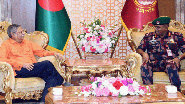রাষ্ট্রপতি মো. সাহাবুদ্দিন এর সাথে সৌজন্য সাক্ষাৎ করেছেন বিজিবি মহাপরিচালক মেজর জেনারেল একেএম নাজমুল হাসান। চোরাচালান, মাদক ও সীমান্ত হত্যা বন্ধে বর্ডার গার্ড বাংলাদেশকে (বিজিবি) কে আরও তৎপর হওয়ার আহ্বান জানিয়েছেন রাষ্ট্রপতি মো. সাহাবুদ্দিন। বুধবার দুপুরে বঙ্গভবনে বিজিবি মহাপরিচালক মেজর জেনারেল একেএম নাজমুল হাসান রাষ্ট্রপতির সাথে সৌজন্য সাক্ষাৎকালে তিনি এ আহ্বান জানান। রাষ্ট্রপতির প্রেস সচিব মো. জয়নাল আবেদীন জানান, সাক্ষাৎকালে বিজিবি প্রধান এই বাহিনীর অপারেশনাল কার্যক্রমসহ সার্বিক কর্মকাণ্ড সম্পর্কে রাষ্ট্রপতিকে অবহিত করেন। এসময় দেশের সীমান্ত রক্ষায় বিজিবির দায়িত্বপূর্ণ ভূমিকার প্রশংসা করেন রাষ্ট্রপ্রধান। রাষ্ট্রপতি মো. সাহাবুদ্দিন মাদকের অনুপ্রবেশ ঠেকাতে ‘জিরো টলারেন্স নীতি’ নিয়ে কাজ করার নির্দেশ দেন বাংলাদেশের সীমান্ত নিরাপত্তার দায়িত্বে নিয়োজিত এই বাহিনীকে। সামনে জাতীয় নির্বাচন উল্লেখ করে রাষ্ট্রপতি বলেন, ‘নির্বাচন সুষ্ঠু, নিরপেক্ষ ও শান্তিপূর্ণ করতে যেকোনো ধরনের অনুপ্রবেশ বন্ধে বিজিবিকে সর্বোচ্চ সতর্ক অবস্থায় থাকতে হবে। এসময় রাষ্ট্রপতির কার্যালয়ের সচিব সম্পদ বড়ুয়া, সামরিক সচিব মেজর জেনারেল এসএম সালাহউদ্দিন ইসলাম এবং সচিব (সংযুক্ত) মো. ওয়াহিদুল ইসলাম খান উপস্থিত ছিলেন।