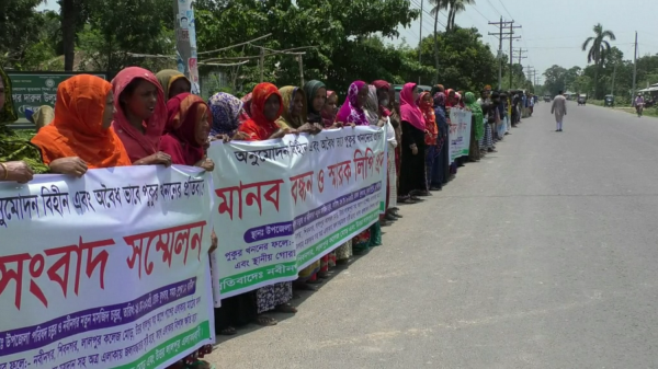 নাটোরের লালপুরে পুকুর খননের প্রতিবাদে মানববন্ধন ও বিক্ষোভ করেছে কয়েক গ্রামের ভুক্তভোগী এলাকাবাসী। বুধবার বিকেলে লালপুর-ঈশ্বরদী সড়কের নবীনগর মসজিদ মোড়ে এই মানববন্ধন ও বিক্ষোভ কর্মসূচি অনুষ্ঠিত হয়। মানববন্ধনে বক্তব্য রাখেন, ২নং ঈশ্বরদী ইউনিয়ন পরিষদের সদস্য আজাবুল ইসলাম ডিলু, শুকুর মোল্লা, মোস্তাফিজুর রহমান, জাফর আলী, জাহিদুর রহমান, আশরাফ আলী প্রমূখ। বক্তারা বলেন, অবৈধভাবে পুকুর খনন করায় তিন ফসলি জমি, গোরস্থান, মসজিদ, সরকারি প্রাথমিক বিদ্যালয় কয়েকটি গ্রাম সহ দুই হাজার হেক্টর জমি জলবদ্ধ হওয়ার আশঙ্কা করছে। এনিয়ে তীব্র ক্ষোভ বিরাজ করছে জমির মালিকদের মধ্যে। সম্প্রতি অবৈধভাবে পুকুর খননের চেষ্টা করলে স্থানীয়দের বাধায় তা বন্ধ হয়ে যায়। কিন্তু প্রভাবশালীরা আবারো পুকুর খননের পায়তারা করছে। স্থানীয় প্রশাসনকে বিষয়টি অবহিত করলেও কোন পদক্ষেপ গ্রহন না করায় ব্যাপক উদ্বেগের সৃষ্টি হয়েছে। অন্যদিকে, পুকুর খননকারীরা ফুল চাষীদের ফুল ঢাকায় পাঠাতে বাধা প্রদান করায় লক্ষাধিক টাকার ফুল নষ্ট হচ্ছে। মানববন্ধন শেষে লালপুর উপজেলা নির্বাহী কর্মকর্তা শামীমা সুলতানার কাছে অবৈধভাবে পুকুর খনন বন্ধের দাবিতে স্মারকলিপি প্রদান করা হয়।