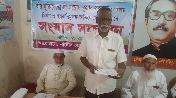 নাটোরে সাবেক সেনা সদস্য বীর মুক্তিযোদ্ধা শ্রী সন্তোষ কুমার সরকার নামের এক বীর মুক্তিযোদ্ধার নামে জাতীয় মুক্তিযোদ্ধা কাউন্সিলের চেয়াম্যানসহ বিভিন্ন কার্যালয়ে মিথ্যা অভিযোগ দিয়ে হয়রানী বন্ধের দাবীতে সংবাদ সম্মেলন করেছেন ভুক্তভুগি ও জেলা মুক্তিযোদ্ধাগণ। রোববার জেলা মুক্তিযোদ্ধাদের ব্যানারে জেলা মুক্তিযোদ্ধা কমপ্লেক্সে এই কর্মসূচীর আয়োজন করা হয়। এতে লিখিত বক্তব্য পাঠ করে ভুক্তভোগী সন্তোষ কুমার সরকার।