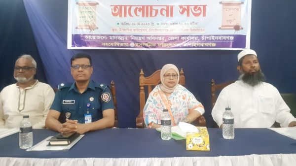 মাদকের কুফল নিয়ে আলোচনা করেন মাদকদ্রব্য নিয়ন্ত্রণ অধিদপ্তর চাঁপাইনবাবগঞ্জ জেলা কার্যালয়ের উপ—পরিচালক মোঃ আনিছুর রহমান খান। স্বাগত বক্তব্য রাখেন ইসলামিক ফাউন্ডেশন চাঁপাইনবাবগঞ্জ জেলা কার্যালয়ের উপ—পরিচালক কৃষিবিদ মোঃ মাহমুদার রহমান। ইসলামিক ফাউন্ডেশন চাঁপাইনবাবগঞ্জ জেলা কার্যালয়ের বিক্রয় সহকারী মোহাম্মদ মুনিরুল ইসলামের সঞ্চালনায় সভা শেষে দোয়া পরিচালনা করেন সদর উপজেলা মডেল মসজিদ ও ইসলামিক সাংস্কৃতিক কেন্দ্রের পেশ ইমাম মাওলানা মোঃ মাহবুবুর রহমান।