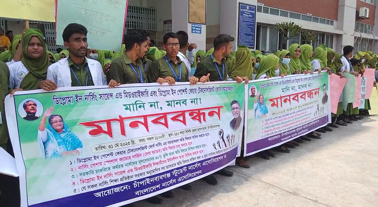 চাঁপাইনবাবগঞ্জে ৫ দফা দাবিতে স্টুডেন্ট নার্সদের বিক্ষোভ ও মানববন্ধন
