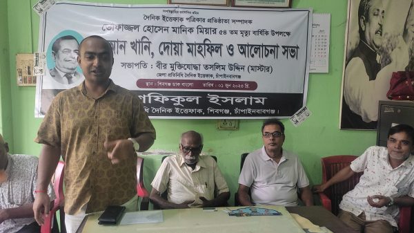 এসময় আরও উপস্থিত ছিলেন শিবগঞ্জ প্রেসক্লাব, শিবগঞ্জ উপজেলা প্রেসক্লাব, শিবগঞ্জ গৌড় প্রেসক্লাবের সদস্যরা। আলোচনা সভায় বক্তাগন দৈনিক ইত্তেফাক পত্রিকার প্রতিষ্ঠাতা সম্পাদক তফাজ্জল হোসেন মানিক মিয়ার জীবনি সম্পর্কে বিস্তারিত আলোচনা করেন এবং মিডিয়া জগতের অগ্রদূত অখ্যায়িত করেন। সভা শেষে মরহুম তফাজ্জল হোসেন মানিক মিয়ার রুহের মাগফেরাত কামনা করে বিশেষ দোয়া হয়।