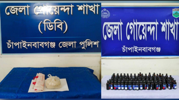 চাঁপাইনবাবগঞ্জে জেলা গোয়েন্দা শাখা ডিবি পুলিশের পৃথক দুটি মাদকবিরোধী অভিযানে ৫০০ গ্রাম হেরোইন ও ১০০ বোতল ফেনসিডিলসহ ২ জন গ্রেপ্তার হয়েছে। গ্রেপ্তারকৃত আসামীরা হচ্ছে, চাঁপাইনবাবগঞ্জের শিবগঞ্জ উপজেলার কালীগঞ্জ গ্রামের বশির আহম্মেদের ছেলে সজিব হোসেন (১৯) ও একই উপজেলার সাহাবাজপুর ইউনিয়নের নামো চাকপাড়ার রোকেয়া বেগম ও মৃত জবদুলের ছেলে মনিরুল ইসলাম ওরফে মন্টু (৩৫)। ২ জুন শুক্রবার রাতে জেলা গোয়েন্দা শাখার অফিসার ইনচার্জ ওসি আলহাজ্ব বাবুল উদ্দিন সরদার মাদকসহ ২ জন গ্রেপ্তারের বিষয় টি এ প্রতিবেদক কে নিশ্চিত করেছেন। জেলা গোয়েন্দা শাখা ডিবি পুলিশের এস.আই আসগর আলী ও এস.আই অনুপ কুমার সরকারের নের্তৃত্বে সঙ্গীয় ফোর্স পৃথক স্থানে অভিযান দুটি পরিচালনা করে। পুলিশ সুত্র জানায়, ৩১ মে বিকেল ৫ টার দিকে গোপন সংবাদের ভিত্তিতে শিবগঞ্জ উপজেলার খাসেরহাট বাজার থেকে ৫০০ গ্রাম হেরোইনসহ হাতেনাতে আসামী সজিবকে গ্রেপ্তার করে ডিবি পুলিশ। অপরদিকে, একই দিন শিবগঞ্জ নামো চাকপাড়ার একটি বাড়িতে অভিযান চালিয়ে ১০০ বোতল ফেনসিডিলসহ মন্টুকে হাতেনাতে গ্রেপ্তার করতে সক্ষম হয় ডিবি পুলিশ। প্রাথমিক জিজ্ঞাসাবাদে আসামীরা মাদক ব্যবসার সাথে জড়িত থাকার কথা স্বীকার করে। এ দুটি ঘটনায় শিবগঞ্জ থানায় মামলা হয়েছে।