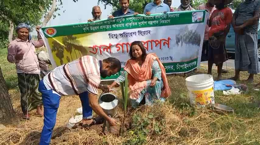 চাঁপাইনবাবগঞ্জে সড়কের দুই ধারে তালের গাছ রোপন কর্মসূচী গ্রহন করেছে কৃষি সম্প্রসারণ অধিদপ্তর। প্রথম পর্যায়ে চাঁপাইনবাবগঞ্জ সদর উপজেলার চৌহদ্দীটোলা কালুপুর সড়কের দুই ধারে ৪০০ তাল গাছ লাগানো হচ্ছে। বিশ^ পরিবেশ দিবসে অনুষ্ঠানিকভাবে তালগাছ লাগানোর এ কর্মসূচীর উদ্বোধন করেন চাঁপাইনবাবগঞ্জ সদর উপজেলা পরিষদের চেয়ারম্যান তসিকুল ইসলাম। এসময় উপস্থিত ছিলেন সদর উপজেলা কৃষি কর্মকর্তা কানিজ তাসনোভা, অতিরিক্ত কৃষি কর্মকর্তা সলেহ আকরামসহ অনান্যরা।