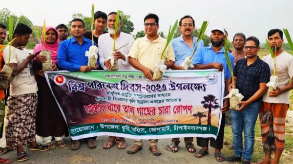 চাঁপাইনবাবগঞ্জের ভোলাহাটে উপজেলা কৃষি অফিস, ভোলাহাটের উদ্যোগে ও আধুনিক প্রযুক্তি সম্প্রসারণের মাধ্যমে রাজশাহী বিভাগের কৃষি উন্নয়ন প্রকল্পের আওতায় ভোলাহাট উপজেলার দলদলী ইউনিয়নের ঘাইবাড়ি গ্রামের বালুটুঙ্গি-জামবাড়িয়া রাস্তায় ৪০০ টি তাল গাছ রোপণ কার্যক্রমের উদ্বোধন হয়েছে। সোমবার ৫ জুন বিশ্ব পরিবেশ দিবস উপলক্ষ্যে তাল গাছ রোপণ করা হয়। এ সময় উপস্থিত ছিলেন উপজেলা চেয়ারম্যান মোঃ রাববুল হোসেন, চেয়ারম্যান, ভোলাহাট উপজলো আওয়ামী লীগের সাধারণ সম্পাদক ও গোহালবাড়ি ইউনিয়ন পরিষদের চেয়ারম্যান মোঃ ইয়াসিন আলী শাহ, দলদলী ইউনিয়ন পরিষদের চেয়ারম্যান মো: মোজাম্মেল হক, উপজেলা কৃষি অফিসার কৃষিবিদ মোঃ সুলতান আলী, সংরক্ষিত মহিলা সদস্য, উপজেলা কৃষি অফিস ভোলাহাটের বিভিন্ন ব্লকের উপসহকারী কৃষি কর্মকতা, স্থানীয় কৃষক ও গন্যমান্য ব্যক্তিবর্গ। উপজেলা কৃষি অফিসার মোঃ সুলতান আলী জানান আবহাওয়া দিন দিন বিরুপ আকার ধারণ করছে, তাপমাত্রা, শিলাবৃষ্টি, বজ্রপাত বৃদ্ধি পাচ্ছে। এজন্য আমাদের গাছ লাগানো প্রয়োজন। তালগাছ একদিকে যেমন রাস্তার শোভা বর্ধন করবে অন্যদিকে পরিবেশের ভারসাম্য রক্ষা ও বজ্রপাত থেকে রক্ষা করবে। গাছ বড় হলে আত্মকর্মসংস্থান হবে। আমি জনপ্রতিনিধি, এলাকাবাসি সহ সকলকে অনুরোধ করবো যেন সবাই বেশি বেশি গাছ লাগাই এবং যে ৪০০ তালগাছ রোপণ করা হলো সেগুলো যেন নষ্ট না করে সবাই মিলে সংরক্ষণ করি।