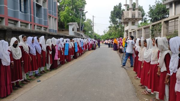 শিবগঞ্জে স্কুলছাত্রকে পিটিয়ে হত্যার বিচারের দাবিতে মানববন্ধন