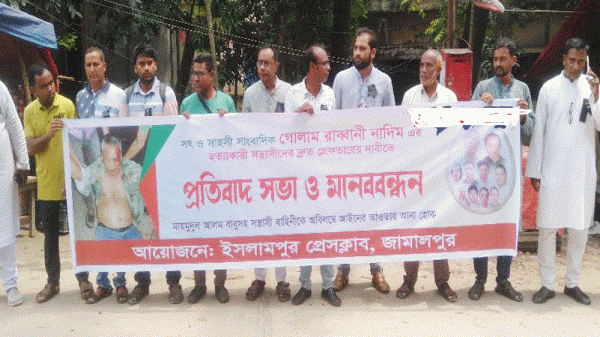 জামালপুরের বকশীগঞ্জে সাধুরপাড়া ইউনিয়ন পরিষদের চেয়ারম্যান মাহমুদুল আলম বাবুর দুর্বৃত্তদের হামলায় বাংলানিউজ টোয়েন্টিফোর.কম এর জেলা প্রতিনিধি ও ৭১ টিভি’র উপজেলা প্রতিনিধি সাংবাদিক গোলাম রব্বানী নাদিম হত্যাকান্ডের চেয়ারম্যানসহ সঙ্গীয়দের দৃষ্টান্ত মূলক শাস্তির দাবীতে প্রতিবাদ সভা ও মানববন্ধন করেছে ইসলামপুর প্রেসক্লাবের সাংবাদিকবৃন্দ। শনিবার বেলা ১১টায় গোলাম রাব্বানী নাদিমের হত্যাকারীদের গ্রেপ্তার এবং দৃষ্টান্তমূলক শাস্তির দাবিতে ইসলামপুর থানা মোড় বটতলা চত্বরে ইসলামপুর প্রেসক্লাবের আয়োজনে প্রতিবাদ সমাবেশ ও মানববন্ধন কর্মসূচি অনুষ্ঠিত হয়। ইসলামপুর প্রেসক্লাবের সভাপতি মোরাদুজ্জামান মোরাদের সভাপতিত্বে এবং সাধারণ সম্পাদক হাফিজ লিটনের সঞ্চালনায় বক্তব্য রাখেন, সিনিয়র সহ-সভাপতি কোরবান আলী,সহ-সভাপতি রহিমা সুলতানা, যুগ্ম সাধারণ সম্পাদক আশিকুর রহমান চায়না, সাবেক সভাপতি ফিরোজ খান লোহানী,সাবেক ভারপ্রাপ্ত সভাপতি খাদেমুল হক বাবুল, সদস্য এম কে দোলন বিশ্বাস, সাহিদুর রহমান, মশিউর রহমান টুটুলসহ অন্যরা।