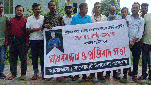 সাংবাদিক নাদিমের হত্যাকারীদের ফাঁসির দাবিতে বাগেরহাটে মানববন্ধন ও প্রতিবাদ সভা