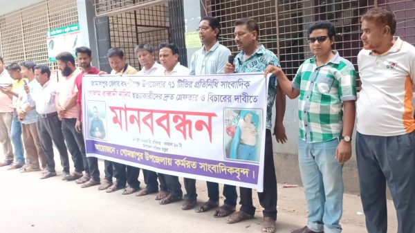 সাংবাদিক নাদিম হত্যার প্রতিবাদে গোমস্তাপুরে মানববন্ধন