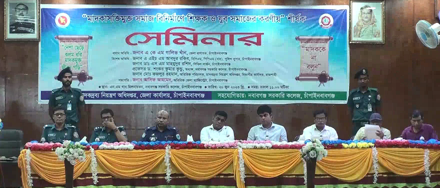 মাদকাসক্তিমুক্ত সমাজ বির্নিমানে শিক্ষক ও যুব সমাজের করনীয় শীর্ষক সেমিনার অনুষ্ঠিত হয়েছে চাঁপাইনবাবগঞ্জে। মঙ্গলবার সকালে জেলা মাদকদ্রব্য নিয়ন্ত্রণ অধিদপ্তরের আয়োজনে নবাবগঞ্জ সরকারি কলেজ মিলনায়তনে এই সেমিনার হয়। সেমিনারে প্রধান অতিথির বক্তব্য রাখেন জেলা প্রশাসক একেএম গালিভ খাঁন। অতিরিক্ত জেলা ম্যাজিস্ট্রেট আসিফ আহমেদের সভাপতিত্বে সেমিনারের বিশেষ অতিথি ছিলেন নবাবগঞ্জ সরকারি কলেজের অধ্যক্ষ প্রফেসর ড. শংকর কুমার কুন্ডু,