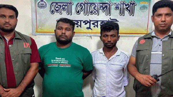 জয়পুরহাটের পাঁচবিবিতে জেলা গোয়েন্দা (ডিবি) পুলিশের সদস্যরা একটি বিদেশি পিস্তল ও ২ রাউন্ড গুলিসহ ২ যুবককে গ্রেপ্তার করেছে। শনিবার (২২ জুলাই) বিকেলে পাঁচবিবি উপজেলার পশ্চিম বালিঘাটা এলাকার টিঅ্যান্ডটি পাড়া থেকে তাদের গ্রেপ্তার করা হয়। রবিবার (২৩ জুলাই) দুপুরে এ তথ্য নিশ্চিত করেছেন জেলা গোয়েন্দা পুলিশ পরিদর্শক শাহেদ আল মামুন। গ্রেপ্তার ব্যক্তিরা হলো-দিনাজপুরের হাকিমপুর উপজেলার মধ্য বাসুদেবপুর স্টেশনপাড়ার মৃত আব্দুর রশিদের ছেলে সুজন হােসন (৩৫) ও একই গ্রামের মৃত আব্দুল হকের ছেলে জয়নাল আবদিন লিটন (৩২)। রবিবার দুপুরে অস্ত্র মামলায় তাদের জেল-হাজতে পাঠানো হয়েছে। জয়পুরহাট জেলা গােয়েন্দা পুলিশ পরিদর্শক শাহেদ আল মামুন জানান, গোপন সংবাদের ভিত্তিতে জেলা পুলিশ সুপার মোহাম্মদ নুর আলমের নির্দেশে জেলার পাঁচবিবি উপজেলার পৌরসভার পশ্চিম বালিঘাটা টিঅ্যান্ডটি মহল্লায় অভিযান পরিচালনা করে বিদেশি পিস্তল ও গুলিসহ তাদের গ্রেপ্তার করা হয়। পরে গ্রেপ্তার ব্যক্তিদের বিরুদ্ধে পাঁচবিবি থানায় অস্ত্র আইনে মামলা করা হয়েছে।