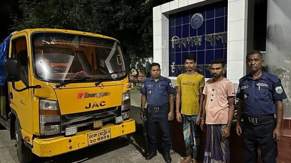 চাঁপাইনবাবগঞ্জের শিবগঞ্জ থানা পুলিশের অভিযানে চাঁদপুর থেকে প্রতারক চক্রের ২ জন সদস্য কে আটক করা হয়েছে। এ সময় একটি পিক-আপ ও ৪ হাজার ৮৪০ কেজি আমসত্ব উদ্ধার করে পুলিশ। আটককৃতরা হচ্ছে, চাঁদপুর জেলার শাহরাস্তি থানার ইছাপুর গ্রামের মোশারফ হোসেনের ২ ছেলে কামরুজ্জামান ওরফে কেনু (৩২) ও জাহেদ আহাম্মদ (২১)। জানা গেছে, শিবগঞ্জ উপজেলার কানসাট এলাকার “মেসার্স আরিফা ট্রেডার্স” এর স্বত্তাধিকারী আরিফুল ইসলাম গত আগস্ট ট্রান্সপোর্ট এজেন্সির মাধ্যমে ভাড়াকৃত একটি ট্রাকের অজ্ঞাতনামা ড্রাইভার ও হেলপার এর নিকট ১১৬ টি বস্তায় ৬ হাজার ১০০ কেজি আমসত্ব কিশোরগঞ্জ জেলার ভৈরব থানা এলাকায় পৌঁছে দেবার জন্য চালান মোতাবেক বুঝিয়ে দেয়। পরের দিন সন্ধ্যা পর্যন্ত আমসত্ব ভর্তি ট্রাকটি গন্তব্যে না পৌঁছালে আমসত্বের মালিক বুঝতে পারেন তিনি প্রতারণার শিকার হয়েছেন। এ বিষয়ে আরিফুল শিবগঞ্জ থানায় লিখিত অভিযোগ করলে অজ্ঞাতনামা আসামীদের বিরুদ্ধে একটি নিয়মিত মামলা হয়। মামলা হবার পর জেলা পুলিশ সুপার ছাইদুল হাসান পিপিএম এর সার্বিক দিক নির্দেশনায়, অতিরিক্ত পুলিশ সুপার রোকনুজ্জামান সরকারের সার্বিক তত্ত্ববধানে শিবগঞ্জ থানা পুলিশের একটি চৌকস আভিযানিক দল দ্রুততম সময়ের মধ্যে সংঘবদ্ধ প্রতারক চক্রটিকে শনাক্ত করতে সক্ষম হয়। পরবর্তীতে ২৬ আগস্ট থেকে ২৯ আগস্ট চাঁদপুর জেলার শাহরাস্তি থানা এলাকায় ধারাবাহিক অভিযান পরিচালনা করে ঘটনার সাথে জড়িত আপন দুই ভাই কেনু ও জাহিদ কে আটক করতে সক্ষম হয় পুলিশ। পুলিশের প্রাথমিক জিজ্ঞাসাবাদে আটককৃতরা স্বীকার করে তারা সংঘবদ্ধ প্রতারক চক্রের সদস্য। দেশের বিভিন্ন প্রান্তে ট্রাক নিয়ে ঘুরে ঘুরে শিকারের অপেক্ষায় থাকে এবং কৌশলে বিভিন্ন রকম পণ্য গন্তব্যে পৌঁছে দেবার কথা বলে আত্মসাৎ করে থাকে। বিষয়টি নিশ্চিত করেন শিবগঞ্জ থানার অফিসার ইনচার্জ চৌধূরী জোবায়ের আহাম্মদ।