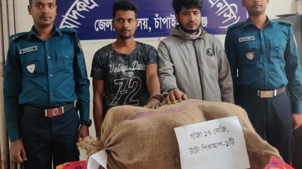 মাদকদ্রব্য নিয়ন্ত্রণ অধিদপ্তর (ডিএনসি) চাঁপাইনবাবগঞ্জ জেলা কার্যালয়ের অভিযানে ১৭ (সতের) কেজি ‘গাঁজা’ এবং গাঁজা পরিবহনে ব্যবহৃত একটি টাটা পিকআপসহ মাদক চোরাচালান চক্রের ২ জন গ্রেফতার হয়েছে। আটক ২ জন হচ্ছে, ট্রাক ড্রাইভার মোঃ জনি ইসলাম (২৮) জেলার শিবগঞ্জ উপজেলার কানসাট বাগদুর্গাপুরের মোঃ মোজাম্মেল হক এর ছেলে এবং হেলপার মোঃ রাজীব হোসেন (২৯) একই এলাকার মৃত সাদিকুল ইসলামের ছেলে। ডিএনসি’র এক প্রেসনোটে জানানো হয়, মাদকদ্রব্য নিয়ন্ত্রণ অধিদপ্তর, চাঁপাইনবাবগঞ্জ জেলা কার্যালয়ের ক-সার্কেলের পরিদর্শক মোঃ ইলিয়াস হোসেন তালুকদার এর নেতৃত্বে একটি আভিযানিক টিম ১২ নভেম্বর চাঁপাইনবাবগঞ্জ জেলার সদর মডেল থানার আমনুরা ঝিলিম বাজার দরগাপাড়া এলাকায় পাকা রাস্তার উপর অভিযান চালায়। এস (ঢাকা মেট্টো-ন-১৫-৬৪৬৪ রেজিস্ট্রেশন নম্বরধারী টাটা পিকআপ গাড়ী গতিরোধ করে ড্রাইভিং সীটে বসা ট্রাক ড্রাইভার মোঃ জনি ইসলাম(২৮) ও হেলপার মোঃ রাজীব হোসেন(২৯) দ্বয়কে আটক করেন। ঘটনাস্থলে উক্ত গাড়ীটি তল্লাশী করে গাড়ীর ভিতর ত্রিপল দিয়ে ঢাকা একটি চটের বস্তার ভিতরে ১৭ গাঁজা উদ্ধার করা হয়। এসময় ঢাকা মেট্টো-ন-১৫-৬৪৬৪ পিকআপ গাড়িটি ও সীমসহ একটি মোবাইল সেট জব্দ করা হয়।