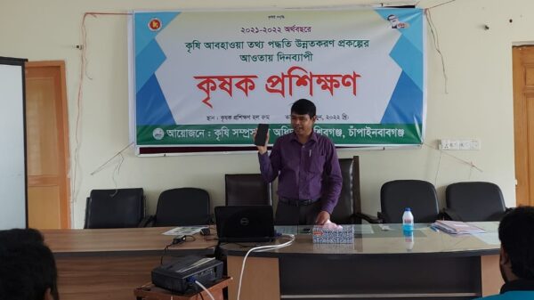 চাঁপাইনবাবগঞ্জ জেলার শিবগঞ্জ উপজেলা কৃষি সম্প্রসারণ অধিদপ্তরের আয়োজনে “কৃষি আবহাওয়া তথ্য পদ্ধতি উন্নতকরণ” প্রকল্পের আওতায় কৃষক প্রশিক্ষণ অনুষ্ঠিত হয়েছে। বৃহস্পতিবার উপজেলা কৃষি অফিসারের কার্যালয়ে ৩০ জন কৃষক/কৃষানীদের দিনব্যাপী এ প্রশিক্ষণ হয়। কৃষি সম্প্রসারণ অফিসার সুনাইন বিন জামান এর সঞ্চালনা সভাপতিত্ব করেন এবং স্বাগত বক্তব্য রাখেন উপজেলা কৃষি অফিসার কৃষিবিদ শরিফুল ইসলাম। প্রশিক্ষণে প্রধান অতিথি ও প্রধান প্রশিক্ষক হিসেবে বক্তব্য রাখেন কৃষি সম্প্রসারণ অধিদপ্তর চাঁপাইনবাবগঞ্জের উপ-পরিচালক কৃষিবিদ নজরুল ইসলাম। প্রধান অতিথি বলেন, জলবায়ু পরিবর্তন এবং প্রাকৃতিক দুর্যোগের ঝুঁকির মধ্যে থাকা দেশগুলোর মধ্যে বাংলাদেশের অবস্থান প্রথম সারিতে। কাজেই নির্ভরযোগ্য কৃষি আবহাওয়া বিষয়ক তথ্য কৃষকদের মাঝে সময়মতো পৌঁছে দেওয়া কৃষি প্রধান বাংলাদেশের জন্য অত্যন্ত গুরুত্বপুর্ণ। এর ফলে প্রতিকুল আবহাওয়ার ক্ষতিকর প্রভাব থেকে যেমন ফসল রক্ষা করা যাবে তেমন অনুকুল আবহাওয়াকে কাজে লাগিয়ে উৎপাদন খরচ কমানোর পাশাপাশি কৃষি উৎপাদন বাড়ানো যাবে। সে কারণেই কৃষি সম্প্রসারণ অধিদপ্তর সারা দেশব্যাপী “কৃষি আবহাওয়া তথ্য পদ্ধতি উন্নতকরণ প্রকল্প” বাস্তবায়ন করছে। তিনি আরো বলেন, কৃষি বিজ্ঞানীদের উদ্ভাবিত প্রযুক্তি কাজে লাগিয়ে কৃষকদের এলাকার ফসল উৎপাদন ও ফসল বৃদ্ধি করতে হবে।