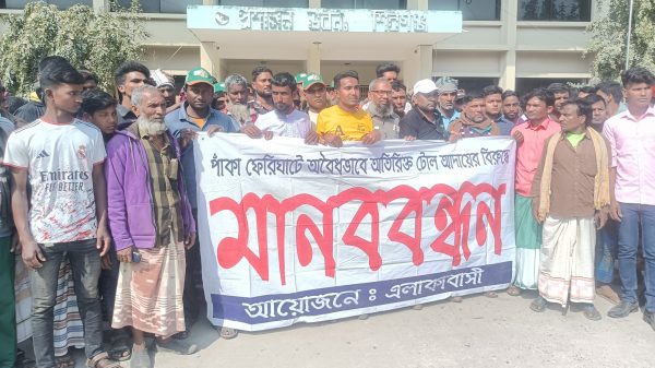 শিবগঞ্জে ফেরীঘাটে অতিরিক্ত টোল আদায়ের প্রতিবাদে মানববন্ধন