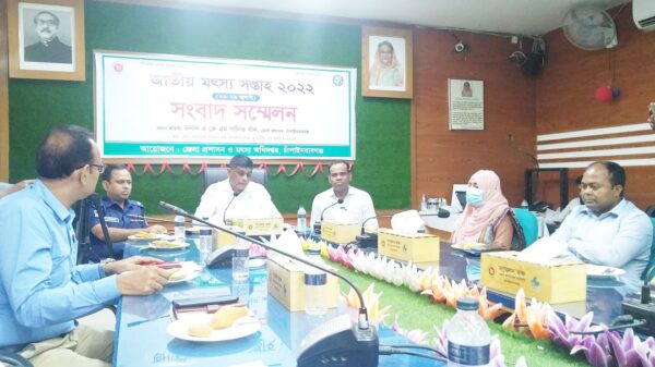 ২৩ জুলাই থেকে ২৯ জুলাই পর্যন্ত জাতীয় মৎস্য সপ্তাহ’র উদ্বোধন হয়েছে চাঁপাইনবাবগঞ্জে। ‘নিরাপদ মাছে ভরব দেশ-বঙ্গবন্ধুর বাংলাদেশ’ শ্লোগানে শনিবার সকাল সাড়ে ১০টায় জেলা প্রশাসকের সম্মেলন কক্ষে জেলা প্রশাসন ও জেলা মৎস্য অফিস সংবাদ সম্মেলন করে। সংবাদ সম্মেলনে প্রধান অতিথি ছিলেন জেলা প্রশাসক এ কে এম গালিভ খান। জেলা মৎস্য অফিসার মো. মাহবুবুর রহমানের সভাপতিত্বে সংবাদ সম্মেলনে বিশেষ অতিথি ছিলেন অতিরিক্ত জেলা ম্যাজিস্ট্রেট দেবেন্দ্র নাথ উরাঁও, অতিরিক্ত পুলিশ সুপার আতোয়ার রহমান। মৎস্য সম্পর্কিত জাতীয় স্থানীয় তথ্য উপস্থাপন করেন জেলা মৎস্য অফিসের সিনিয়র সহকারী পরিচালক আবুল কালাম আজাদ। সংবাদ সম্মেলনে জানানো হয়, চাঁপাইনবাবগঞ্জ জেলায় মোট মৎস্য চাষি ৬ হাজার ৫’শ ৫৪ জন। মৎস্যজীবী ৯ হাজার ৮’শ ৬৯ জন। আর জেলায় পুকুর রয়েছে ১১ হাজার ৫৪৯টি। এর মধ্যে সরকারি পুকুর ৩ হাজার ১৬টি এবং বেসরকারি পুকুর ৮ হাজার ৩৩টি। বিল ৬৩টি, প্লাবনভূমি ৬৯টি এবং নদী ৪টি। জেলায় মোট মাছের চাহিদা ২৪ হাজার ৮৭৬ মেট্রিক টন। উৎপাদন ২০ হাজার ১ মেট্রিক টন। জেলায় মাছের ঘাটতি ৪ হাজার ৮৭৫ মেট্রিক টন।