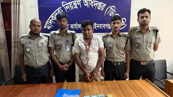 চাঁপাইনবাবগঞ্জে অভিযান চালিয়ে ১৩০ গ্রাম হেরোইনসহ কথিত সাংবাদিক এক মাদককারবারি কে গ্রেফতার করেছে মাদকদ্রব্য নিয়ন্ত্রণ অধিদপ্তর ডিএনসি’র চাঁপাইনবাবগঞ্জ জেলা কার্যলয়ের সদস্যরা। গ্রেফতারকৃত মাদক ব্যবসায়ী চাঁপাইনবাবগঞ্জ সদর উপজেলার রাণীহাটি ইউনিয়নের রামচন্দ্রপুর এলাকার সুধির চন্দ্র রবিদাসের ছেলে শ্যামল রবিদাস (২৮)। এক সংবাদ বিজ্ঞপ্তির মাধ্যমে এ তথ্য জানান মাদকদ্রব্য নিয়ন্ত্রণ অধিদপ্তর চাঁপাইনবাবগঞ্জ জেলা কার্যালয়ের ক-সার্কেলের পরিদর্শক মোঃ ইলিয়াস হোসেন তালুকদার। প্রেসনোটে জানানো হয়, মাদকদ্রব্য নিয়ন্ত্রণ অধিদপ্তর চাঁপাইনবাবগঞ্জ জেলা কার্যালয়ের উপ-পরিচালক চৌধুরী ইমরুল হাসান এর সার্বিক দিক-নির্দেশনায় সোমবার (২৮ এপ্রিল) সকাল ৮ টার দিকে গোপন সংবাদের ভিত্তিতে মাদকদ্রব্য নিয়ন্ত্রণ অধিদপ্তর চাঁপাইনবাবগঞ্জ জেলা কার্যালয়ের ক-সার্কেলের পরিদর্শক মোঃ ইলিয়াস হোসেন তালুকদার এর নেতৃত্বে চাঁপাইনবাবগঞ্জ পৌরসভার মিস্ত্রীপাড়া এলাকার শ্যামলের ভাড়া বাড়ি ঘেরাও করে অভিযান পরিচালনা করা হয়। অভিযানে ১৩০ গ্রাম হেরোইন ও নগদ ৬৩ হাজার ৪১০ টাকা, ১টি স্মার্ট ফোন, হেরোইন পরিমাপক ডিজিটাল যন্ত্র ১টিসহ ভূয়া সাংবাদিক শ্যামলকে গ্রেফতার করা হয়। এ ঘটনায় চাঁপাইনবাবগঞ্জ সদর মডেল থানায় আইনগত ব্যবস্থা গ্রহণ করা হয়েছে।