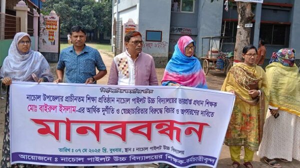 নাচোলে প্রধান শিক্ষককে অপসারণের দাবীতে শিক্ষক- কর্মচারীদের মানববন্ধন