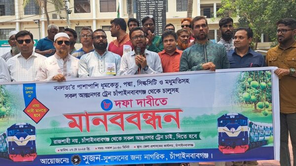 চা দোকান মালিক সমিতির সভাপতি কামরুজ্জামান মুক্তাসহ অন্যরা। মানববন্ধনে বক্তারা, নানাভাবে অবহেলিত চাঁপাইনবাবগঞ্জ জেলাবাসী আট দফা প্রাণের দাবি পুরণে রেল মন্ত্রণালয়ের উপদেষ্টাসহ প্রধান উপদেষ্টার আশু হস্তক্ষেপ কামনা করেন। জেলা সুজনের সম্পাদক মনোয়ার হোসেন জুয়েল তার স্বাগত বক্তব্যে বলেন, দেশের রাজধানী ঢাকা পর্যন্ত চলাচলের জন্য চাঁপাইনবাবগঞ্জ জেলাবাসীকে খুব ভোরে একমাত্র আন্তঃনগর ট্রেন বনলতার উপর নির্ভর করতে হয়। অথচ অন্যান্য আন্তঃনগর ট্রেন রাজশাহী জেলা পর্যন্ত এসে অযথা কালক্ষেপণ করে সেখানেই অবস্থান করে। যা দেশের উত্তর- পশ্চিমাঞ্চলের মানুষের সাথে বৈষম্যের সৃষ্টি করেছে। পতিত ফ্যাসিস্ট আওয়ামীলীগ সরকার ও তার দোসররা জোরপূর্বক এসকল আন্তঃনগর ট্রেন রাজশাহী রেলওয়ে ষ্টেশনে আটকিয়ে রাখে এবং চাঁপাইনবাবগঞ্জ জেলার সাধারণ মানুষকে তাদের প্রাপ্য নায্য অধিকার থেকে বঞ্চিত করে এসেছে। তিনি বলেন, বিষয়টি শুধুমাত্র বৈষম্যই নয়, চরম অমানবিকও বটে। এই অঞ্চলের সর্বশেষ রেলওয়ে ষ্টেশন চাঁপাইনবাবগঞ্জ হওয়া স্বত্ত্বেও ধুমকেতু, পদ্মা, সিল্কসিটি ও মধুমতি আন্তঃনগর ট্রেনগুলো নানা’ন অযৌক্তিক অজুহাতে রাজশাহী থেকে চাঁপাইনবাবগঞ্জ জেলায় প্রবেশ করতে দেয়া হয় না। ফলে এই এলাকার মানুষ বিশেষ করে নারী, শিশু এবং মুমুর্ষ রোগী অত্যন্ত কষ্ট করে চাঁপাইনবাবগঞ্জ থেকে প্রায় ৫০ কিলোমিটার দূরে অবস্থিত রাজশাহী রেলওয়ে ষ্টেশনে ট্রেনে উঠতে বাধ্য হয়। ফিরতি পথে একইভাবে রাজশাহী রেলওয়ে ষ্টেশনে নেমে পুনরায় বাসযোগে চাঁপাইনবাবগঞ্জ জেলা সদর সহ ভোলাহাট, শিবগঞ্জ, নাচোল, গোমস্তাপুর এবং নওগাঁ জেলার পোরশা ও নিয়ামতপুর উপজেলাসহ পাশ্ববর্তী অঞ্চলের মানুষ অত্যন্ত ঝুকিপূর্ণ পরিস্থিতিতে যাতায়াত করেন। ফলশ্রুতিতে আমরা এই অঞ্চলের জনসাধারণ দীর্ঘদিন ধরে চাঁপাইনবাবগঞ্জ রেলওয়ে ষ্টেশন হতে সকল আন্তঃনগর ট্রেন চলাচলের জোর দাবি জানিয়ে আসছি।
