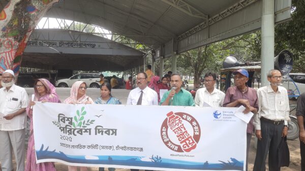 প্লাস্টিক দূষণ রোধসহ ১৪ দাবিতে চাঁপাইনবাবগঞ্জে সনাক-টিআইবি’র মানববন্ধন