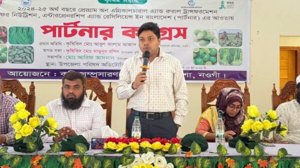 “কৃষিই সমৃদ্ধি” এর আলোকে নওগাঁর পোরশায় কৃষকদের নিয়ে পার্টনার কংগ্রেস সভা অনুষ্ঠিত হয়েছে। কৃষি সম্প্রসারন অধিদপ্তর পোরশার আয়োজনে সোমবার দিনব্যাপি উপজেলা পরিষদ মিলনায়তনে ২০২৪-২০২৫ অর্থ বছরে প্রোগ্রাম অন এগ্রিকালচারাল এ্যান্ড রুরাল ট্রান্সফরমেশন ফর নিউট্রিশন, এন্টারপ্রেনরশিপ এন্ড রেসিলিয়েন্স ইন বাংলাদেশ (পার্টনার) এর আওতায় অনুষ্ঠিত কংগ্রেস সভায় সভাপতিত্ব করেন ইউএনও মো. আরিফ আদনান। প্রধান অতিথি ছিলেন কৃষি সম্প্রসারন অধিদপ্তর নওগাঁর উপপরিচালক আবুল কালাম আজাদ। সভায় উত্তম কৃষি চর্চার মাধ্যমে কৃষি বা নিরাপদ খাদ্য উৎপাদন, নতুন নতুন কৃষি জাত ফসলের সম্প্রসারণ, কৃষিতে জৈব বালাইনাশকের ব্যবহার বৃদ্ধিসহ কীটনাশকের ব্যবহার কমানো, চাষাবাদে আধুনিক যন্ত্রপাতির ব্যবহার বৃদ্ধির উপর স্বাগত বক্তব্য রাখেন উপজেলা কৃষি কর্মকর্তা কৃষিবিদ মামুনুর রশিদ। এসময় উপজেলা সহকারী কমিশনার (ভূমি) নাবিলা ফেরদৌস, প্রকল্প বাস্তবায়ন কর্মকর্তা মাহমুদুল হক টিটু, উপসহকারী কৃষি কর্মকর্তা নিয়ামতুল্লাহ ও আফজাল হোসেন সহ বিভিন্ন ইউনিয়ন থেকে আগত শতাধীক কৃষক, রাজনৈতিক ব্যক্তিবর্গ, খামারিগণ উপস্থিত ছিলেন।