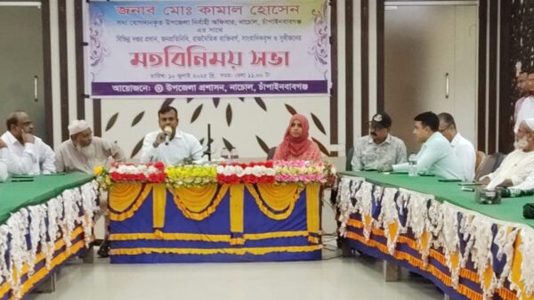 চাঁপাইনবাবগঞ্জের নাচোল উপজেলায় সদ্য যোগদানকৃত উপজেলা নির্বাহী অফিসার কামাল হোসেন নাচোল উপজেলার বিভিন্ন দপ্তরের কর্মকর্তা, জনপ্রতিনিধি, রাজনৈতিক ব্যক্তিবর্গ, সাংবাদিক ও সুধীজনদের সাথে মতবিনিময় করছেন। বৃহস্পতিবার (১০ জুলাই) উপজেলা পরিষদ মিলনায়তনে এ মতবিনিময় সভা করেন। মতবিনিময়কালে নাচোলের সংক্ষিপ্ত ইতিহাস তুলে ধরেন সহকারী কমিশনার (ভূমি) সুলতানা রাজিয়া। উপস্থিত সকলে ইলামিত্রের বরেন্দ্র ভূমিকে এগিয়ে নিতে উপজেলা নির্বাহী অফিসারের সহযোগিতা কামনা করেন। এছাড়াও কৃষিনির্ভর খাদ্য উদ্বৃত্ত্ব নাচোলে কৃষি পণ্য উৎপন্ন, বিপনন ও ন্যয্যমূল্য পাওয়ার জন্য ইউএনও’র সহযোগিতা কামনা করেন। সভায় উপজেলা নির্বাহী অফিসার অত্র উপজেলাকে এগিয়ে নিতে সকলের সহযোগিতা কামনা করেন।