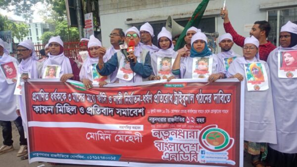 ৩ মাসের মধ্যে ধর্ষকের ফাঁসির দাবিতে এনডিবি’র প্রতিকি কাফন মিছিল
