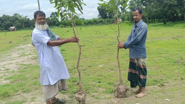 নওগাঁর পোরশায় তিনশতাধিক আমগাছ উপড়ে ফেলেছে দুর্বৃত্ত্বরা। ঘটনাটি ঘটেছে রবিবার দিবাগত রাতে উপজেলার শিশা খরপা মৌজায়। জানা গেছে, শিশা গ্রামের মৃত ইয়াছিন চৌধুরীর ছেলে জিল্লু রহমান চৌধুরীসহ তাদের অংশীদারগণ দির্ঘদিন ধরে খরপা মৌজার সিএস-৭৫,৪২৫ ও ১৭৩ নং দাগের প্রায় ৮বিঘা জমি ভোগ দখল করে আসছিল। এরই মধ্যে জমিতে তারা প্রায় ৪০০টি আমগাছ রোপন করেছিলেন। কিন্তু রবিবার দিবাগত রাতে দুর্বৃত্ত্বরা আমগাছ গুলি সম্পূর্ণভাবে উপড়ে ফেলে দিয়েছে। জিল্লু রহমান চৌধুরী জানান, সম্পূর্ণ জমির মালিক তিনি এবং তার অংশীদারগণ। এ জমির কাগজপত্র তাদের রয়েছে। কিন্তু হঠাৎ করে নওগাঁর তাহের চৌধুরীর ছেলে আবু তৈয়ব খোরশেদ আলম চৌধুরী ওই জমি নিজের দাবি করে জমি দখলের চেষ্টা করেন। এব্যাপারে তাৎক্ষনিক তারা থানায় অবগত করলে থানায় উপস্থিত হয়ে খোরশেদ আলম জমির কোন কাগজপত্র দেখাতে পারেননি। বরং ১৫/৪/১৯৪৭ইং সালের একটি সৃজনকৃত দলিল দেখিয়েছেন। যার কোন অস্তিত্ব নেই বলে তিনি জানান। জিল্লুর রহমান আরো জানান, কাগজপত্র দেখাতে না পেয়ে খোরশেদ আলম তাদের বিভিন্ন ভাবে ভয়ভিতি দেখাচ্ছেন এবং জমিতে না যাওয়ার জন্য চাপ দিচ্ছেন। রবিবার রাতে খোরশেদ আলমের ভাড়া করা লোকজন আমগাছ গুলি উপড়ে ফেলেছেন বলে তিনি বলছেন। এব্যাপারে পোরশা থানায় তারা মামলা করার প্রস্তুতি নিচ্ছেন বলে তিনি জানান। পোরশা থানা অফিসার ইনচার্জ আবু বকর সিদ্দিক জানান, বিষয়টি তিনি তেঁতুলিয়া ইউনিয়ন পরিষদের প্যানেল চেয়ারম্যান শহিদুল ইসলামের নিকট থেকে শুনেছেন। ভুক্তভোগিরা থানায় এসে অভিযোগ করলে ব্যবস্থা নেয়া হবে।