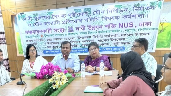 চাঁপাইনবাবগঞ্জ জেলার নাচোল উপজেলায় “নারী উন্নয়ন শক্তি”-এর আয়োজনে “জেন্ডার পলিসি ও যৌন নিপীড়ন, নির্যাতন ও হয়রানি প্রতিরোধ” বিষয়ক কর্মশালা হয়েছে। এ কর্মশালায় অংশগ্রহণ করেন উপজেলার বিভিন্ন কমিউনিটি-ভিত্তিক নারী নেতৃত্বাধীন ক্ষুদ্র এনজিও ও সামাজিক সংগঠনের প্রধান নির্বাহীরা। উদ্বোধনী অনুষ্ঠানে প্রধান অতিথি হিসেবে উপস্থিত ছিলেন নাচোল উপজেলা নির্বাহী কর্মকর্তা মোঃ কামাল হোসেন। বিশেষ অতিথি হিসেবে উপস্থিত ছিলেন নাচোল থানার অফিসার ইনচার্জ মোঃ মনিরুল ইসলাম, ফোরাম ফর কালচার অ্যান্ড হিউম্যান ডেভেলপমেন্ট’র নির্বাহী পরিচালক, ড. সুলতান মোহাম্মদ রাজ্জাক। সভাপতিত্ব করেন নাচোল উপজেলা মহিলা বিষয়ক কর্মকর্তা প্রভাতী মাহাতো। কর্মশালার মূল বক্তব্য ও প্রশিক্ষণ সেশন পরিচালনা করেন নারী উন্নয়ন শক্তির নির্বাহী পরিচালক ড. আফরোজা পারভীন। তিনি অংশগ্রহণকারী এনজিও প্রতিনিধিদের জন্য একটি বাস্তবভিত্তিক গাইডলাইন উপস্থাপন করেন, যা অনুসরণ করলে যৌন নির্যাতন, পারিবারিক সহিংসতা, বাল্যবিবাহ, জোরপূর্বক বিবাহ, নারী ও শিশু পাচার, এবং যৌতুকের বিরুদ্ধে কার্যকর প্রতিরোধ গড়ে তোলা সম্ভব হবে বলে তিনি মত প্রকাশ করেন। উপজেলা নির্বাহী কর্মকর্তা মোঃ কামাল হোসেন বলেন, আমাদের এই উপজেলার পিছিয়ে পড়া জনগোষ্ঠীকে সচেতনতা, প্রশিক্ষণ ও দক্ষতা বৃদ্ধির মাধ্যমে স্বনির্ভর করে তুলতে হবে। যাতে তারা পরিবার ও সমাজে সম্মানের সাথে সিদ্ধান্ত গ্রহণে অংশ নিতে পারে। ওসি মোঃ মনিরুল ইসলাম বলেন, আপনারা নির্ভয়ে কাজ করবেন। কোনো ধরনের নির্যাতন বা হয়রানির শিকার হলে পুলিশ আপনাদের পাশে থাকবে, এটাই আজকের অঙ্গীকার। কর্মশালাটি উপজেলার নারী নেতৃত্বকে উৎসাহিত করতে এবং একটি বৈষম্যহীন ও নিরাপদ সমাজ গঠনে সচেতনতা বৃদ্ধির লক্ষ্যে আয়োজন বলছেন আয়োজক কর্তৃপক্ষ।
