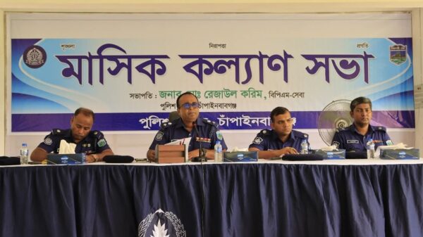 জেলা পুলিশ লাইন্সে ড্রিল শেডে মাসিক কল্যান সভায় চাঁপাইনবাবগঞ্জ পুলিশ সুপার মোঃ রেজাউল করিম বিপিএম-সেবা-উপস্থিত অফিসার ও ফোর্সদের উদ্দেশ্যে দিকনির্দেশনামূলক বক্তব্য প্রদান করেন। তিনি অফিসার ও ফোর্সদের সার্বিক কল্যাণ সংক্রান্ত বিভিন্ন বিষয় মনোযোগ সহকারে শোনেন এবং সংশ্লিষ্ট ইনচার্জবৃন্দকে কার্যকরী ব্যবস্থা গ্রহণের জন্য নির্দেশ প্রদান করেন।