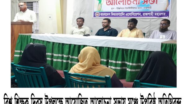 বিশ্ব শিক্ষক দিবস উপলক্ষে রবিবার বিকেলে বাংলাদেশ কিন্ডারগার্টেন এ্যাসোসিয়েশন রাজশাহী মহানগর শাখার উদ্দ্যোগে রাজশাহী মহানগর শাখার সভাপতি রফিকুল আলমের সভাপতিত্বে ও কেন্দ্রীয় কমিটির সদস্য আব্দুর রাজ্জাক রিপনের সঞ্চালনায় আলোচনা সভা রাজশাহী সিটি আইডিয়াল স্কুল মিলনায়তনে অনুষ্ঠিত হয়। অনুষ্ঠানে প্রধান অতিথি হিসেবে ছিলেন বাংলাদেশ কিন্ডারগার্টেন এ্যাসোসিয়েশন কেন্দ্র কমিটির আইন বিষয়ক সম্পাদক রাজশাহী সিটি আইডিয়াল স্কুলের অধ্যক্ষ মিজানুর রহমান মিজান। বিশেষ অতিথি হিসেবে ছিলেন যথাক্রমে কেন্দ্রীয় কমিটির পরিবেশ বিষয়ক সম্পাদক অবনি বিদ্যা নিকেতনের পরিচালক শাহজাহান আলী পিয়াস ও রাজশাহী মহানগর কমিটির ভারপ্রাপ্ত সাধারণ সম্পাদক ব্লু-বার্ড স্কুলের পরিচালক মোঃ মামুনুর রশিদ মিঠু। অনুষ্ঠানে বিভিন্ন শিক্ষা প্রতিষ্ঠানের পরিচালক সহ শিক্ষক শিক্ষিকাবৃন্দ উপস্থিত ছিলেন।