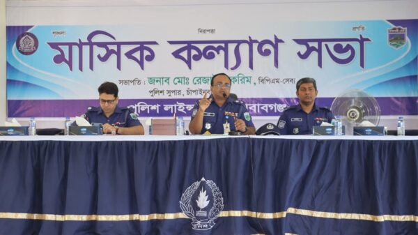জেলা পুলিশ লাইন্সে ড্রিল শেডে মাসিক কল্যান সভায় চাঁপাইনবাবগঞ্জ পুলিশ সুপার মোঃ রেজাউল করিম উপস্থিত অফিসার ও ফোর্সদের উদ্দেশ্যে দিকনির্দেশনামূলক বক্তব্য প্রদান করেন এবং অফিসার ও ফোর্সদের সার্বিক কল্যাণ সংক্রান্ত বিভিন্ন বিষয় মনোযোগ সহকারে শোনেন এবং সংশ্লিষ্ট ইনচার্জবৃন্দকে কার্যকরী ব্যবস্থা গ্রহণের জন্য নির্দেশ প্রদান করেন।