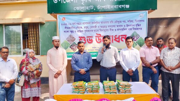 চাঁপাইনবাবগঞ্জের ভোলাহাটে কৃষি প্রণোদনা বিতরণ করা হয়েছে। ২০ অক্টোবর সোমবার ১০:০০ টার সময় রবি প্রণোদনা/২০২৫-২৬ কর্মসূচির শূভ উদ্বোধন করেছেন সদ্য যোগদানকৃত সহকারী কমিশনার (ভূমি) মোঃ শামীম হোসেন। উদ্বোধনী অনুষ্ঠানে স্বাগত বক্তব্য রাখেন উপজেলা কৃষি অফিসার কৃষিবিদ মোঃ সুলতান আলী। উদ্ভিদ সংরক্ষণ উপ-সহকারী কৃষি অফিসার মোঃ আখতারুল ইসলামের সঞ্চালনায় এসময় উপস্থিত ছিলেন উপজেলা কৃষি সম্প্রসারণ অফিসার মোঃ সাইদুর রহমান, সমাজসেবা অফিসার মোঃ নাসিম উদ্দিন, উপজেলা পল্লী উন্নয়ন অফিসার মোঃ সবুজ আলী, উপজেলা যুব উন্নয়ন অফিসার মোঃ রবিউল ইসলাম কবিরাজ, উপজেলা খাদ্য কর্মকর্তা, একাডেমিক সুপারভাইজার মোঃ হারুনর রশিদ সহ বিভিন্ন এলাকার সুবিধাভোগী কৃষকবৃন্দ। ২০২৫-২৬ অর্থ বছরে রবি মৌসুমে গম, সরিষা, চিনাবাদাম, শীতকালীন পেঁয়াজ, মসুর, খেসারি ও অড়হড় ফসলের আবাদ ও উৎপাদন বৃদ্ধির জন্য ক্ষুদ্র ও প্রান্তিক কৃষকের মাঝে বিনামূল্যে বীজ ও রাসায়নিক সার সহায়তা প্রণোদনা কর্মসূচির আওতায় ভোলাহাট উপজেলায় ৪৪৯০ (চারহাজার চারশত নববই) জন/বিঘা বরাদ্দ পাওয়া গেছে। রবি মৌসুমে গম, সরিষা, চিনাবাদাম, শীতকালীন পেঁয়াজ, মসুর, খেসারি ও অড়হড় চাষে সহযোগিতার জন্য অনুমোদিত অগ্রাধিকার তালিকাভূক্ত একজন কৃষক একটি মাত্র ফসল পাবেন। একজন কৃষক ১ বিঘা জমির জন্য ২০ (বিশ) কেজি করে গম বীজ অথবা ০১ (এক) কেজি করে সরিষা বীজ অথবা ১০ (দশ) কেজি করে চিনাবাদাম বীজ অথবা ০১ (এক) কেজি করে শীতকালীন পেঁয়াজ বীজ সাথে ১০ কেজি ডিএপি ও ১০ কেজি এমওপি সার অথবা ০৫ (পাঁচ) কেজি করে মুগ বীজ অথবা ০৫ (পাঁচ) কেজি করে মসুর বীজ অথবা ০৮ (আট) কেজি করে খেসারি বীজ অথবা ০২ (দুই) কেজি করে অড়হড় বীজ সাথে ১০ কেজি ডিএপি ও ৫ কেজি এমওপি সার বিতরণ করা হয়েছে।
