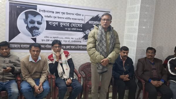 বাংলাদেশ পূজা উদযাপন পরিষদ চাঁপাইনবাবগঞ্জ জেলা শাখা ও সার্বজনীন পূজা কমিটির সাবেক সভাপতি বাবুল কুমার ঘোষের ৭ম মৃত্যুবার্ষিকী পালিত হয়েছে। এ উপলক্ষে বাংলাদেশ পূজা উদযাপন পরিষদ চাঁপাইনবাবগঞ্জ জেলা ও সার্বজনীন পূজা কমিটির উদ্যোগে মঙ্গলবার সন্ধ্যা সাড়ে ৭ টার শ্রী শ্রী রামসীতা মন্দিরে এক আলোচনা সভা বাংলাদেশ পূজা উদযাপন পরিষদ চাঁপাইনবাবগঞ্জ জেলা শাখার সভাপতি ডাবলু কুমার ঘোষের সভাপতিত্বে অনুষ্ঠিত হয়। আলোচনায় অংশ নেন, বাংলাদেশ পূজা উদযাপন পরিষদ, চাঁপাইনবাবগঞ্জ জেলা শাখার সাধারণ সম্পাদক শ্রী ধনঞ্জয় চ্যাটার্জী, চাঁপাইনবাবগঞ্জ সদর উপজেলা শাখার সাধারণ সম্পাদক শ্রী স্বপন কুমার ঘোষ, চাঁপাইনবাবগঞ্জ পৌর পূজা উদযাপন কমিটর সভাপতি অপূর্ব সাহা, জেলা কমিটির সদস্য ও শ্রীশ্রী রামসীতা মন্দিরের সাধারণ সম্পাদক প্রবীর ঘোষ, বাংলাদেশ হিন্দু বৌদ্ধ খ্রিষ্টান ঐক্য পরিষদ চাঁপাইনবাবগঞ্জ পৌর শাখার সাধারণ সম্পাদক শ্রী সমিত চট্টোপধ্যায়, চাপাইনবাবগঞ্জ প্রধান ডাকঘরের সাবেক পোষ্টমাস্টার শ্রী লক্ষণ দাস। সভার শুরুতে গীতা পাঠ করেন শ্রী চন্দ পান্ডে। সমগ্র অনুষ্ঠানটি সঞ্চালনা করেন বাংলাদেশ পূজা উদযাপন পরিষদ চাঁপাইনবাবগঞ্জ সদর উপজেলা শাখার সভাপতি শ্রী স্বপন কুমার ঘোষ। আলোচনা সভা শেষে, প্রয়াত বাবুল কুমার ঘোষের আত্মার শান্তি কামনা করে প্রার্থনা এবং প্রসাদ বিতরণ করা হয়। উল্লেখ্য, প্রয়াত বাবুল কুমার ঘোষ, চাঁপাইনবাবগঞ্জ পৌরসভার সাবেক সফল চেয়ারম্যান আব্দুল মান্নান সেন্টুর ঘনিষ্ঠ সহচর ছিলেন। তিনি স্বৈরাচার বিরোধী আন্দোলনে চাঁপাইনবাবগঞ্জে অগ্রণী ভূমিকা পালন করেন এবং বেশ কয়েকবার কারাবরণও করেন। একসময় সাংবাদিকতা পেশার সঙ্গেও যুক্ত ছিলেন তিনি। ২০১৯ সালের ৯ ফেব্রুয়ারি ঢাকার মগবাজারে বেসরকারি হাসপাতাল রাসমনিতে চিকিৎসাধীন অবস্থায় তিনি শেষ নিঃশ্বাস ত্যাগ করেন।