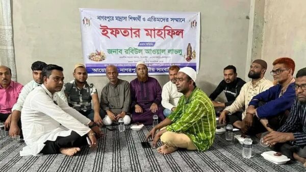 পবিত্র মাহে রমজান উপলক্ষে টাঙ্গাইলের নাগরপুরে এতিম শিশু ও মাদ্রাসা শিক্ষার্থীদের নিয়ে দোয়া ও ইফতার মাহফিল অনুষ্ঠিত হয়েছে। উপজেলার ঘিওরকোল বারিয়া ইসলামিয়া মাদ্রাসা ও এতিমখানা প্রাঙ্গণে জাতীয় সাংবাদিক সংস্থা নাগরপুর উপজেলা ইউনিটের উদ্যোগে এ আয়োজন করা হয়। অনুষ্ঠানে সভাপতিত্ব করেন জাতীয় সাংবাদিক সংস্থা নাগরপুর উপজেলা ইউনিটের সভাপতি এস এম আনোয়ার হোসেন। অনুষ্ঠানে প্রধান অতিথি হিসেবে মুঠোফোনে (মোবাইল কনফারেন্স) যুক্ত হয়ে বক্তব্য রাখেন টাঙ্গাইল-৬ (নাগরপুর-দেলদুয়ার) আসনের মাননীয় সংসদ সদস্য ও জাতীয় সাংবাদিক সংস্থার প্রধান উপদেষ্টা রবিউল আউয়াল লাভলু। প্রধান অতিথি বলেন, “মাদ্রাসা শিক্ষার্থী ও এতিম শিশুদের পাশে দাঁড়ানো আমাদের নৈতিক ও ধর্মীয় দায়িত্ব। বিশেষ কারণে সশরীরে উপস্থিত থাকতে না পারলেও এই মহতী উদ্যোগের সঙ্গে আমি একাত্মতা প্রকাশ করছি। সমাজের সুবিধাবঞ্চিত শিশুদের কল্যাণে সাংবাদিকদের এমন মানবিক উদ্যোগ সত্যিই প্রশংসনীয়। অনুষ্ঠানে বিশেষ অতিথি হিসেবে উপস্থিত ছিলেন নাগরপুর উপজেলা প্রেসক্লাবের সভাপতি মোঃ আক্তারুজ্জামান বকুল, সাধারণ সম্পাদক মোঃ এরশাদ মিয়া এবং মেসার্স রাব্বি এন্টারপ্রাইজের বিশিষ্ট ব্যবসায়ী মোঃ আঃ আওয়াল খোকন। জাতীয় সাংবাদিক সংস্থা নাগরপুর উপজেলা ইউনিটের সাধারণ সম্পাদক মোঃ আজিজুল হক বাবুর সঞ্চালনায় অনুষ্ঠানে আরও উপস্থিত ছিলেন নাগরপুর-দেলদুয়ার অনলাইন এনটিভির প্রতিনিধি মোঃ মনির হাসান, চৌহালী উপজেলার সময়ের কণ্ঠস্বর প্রতিনিধি মোঃ রোকুনুজ্জামান রোকু, জাতীয় সাংবাদিক সংস্থার নেতৃবৃন্দ, প্রেসক্লাবের সাংবাদিকবৃন্দসহ স্থানীয় গণ্যমান্য ব্যক্তিরা। ইফতারের আগে দেশ, জাতি ও মুসলিম উম্মাহর শান্তি, সমৃদ্ধি ও কল্যাণ কামনায় বিশেষ দোয়া ও মোনাজাত করা হয়। পরে অতিথিবৃন্দ, সাংবাদিক নেতৃবৃন্দ এবং উপস্থিত মুসল্লিরা ঘিওরকোল বারিয়া ইসলামিয়া মাদ্রাসার শিক্ষার্থী ও এতিম শিশুদের সঙ্গে একসঙ্গে ইফতার করেন। রমজানের পবিত্রতা ও মানবিকতার বার্তা ছড়িয়ে দিতে এ ধরনের আয়োজন গুরুত্বপূর্ণ ভূমিকা রাখবে বলে আয়োজকরা আশা প্রকাশ করেন।