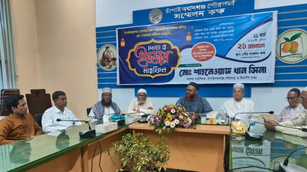 ‘দৈনিক চাঁপাই দর্পণ’ এর প্রকাশক ও সম্পাদক, চ্যানেল আই’র জেলা প্রতিনিধি আশরাফুল ইসলাম রঞ্জু, চাঁপাইনবাবগঞ্জ জেলা প্রেসক্লাবের সভাপতি হোসেন শাহনেওয়াজ, চাঁপাইনবাবগঞ্জ টেলিভিশন জার্নালিষ্ট এ্যাসোসিয়েশনের সভাপতি রফিকুল আলম, চাঁপাইনবাবগঞ্জ প্রেসক্লাবের সাধারণ সম্পাদক ফয়সাল মাহমুদ, অধ্যক্ষ মোঃ হুমায়ন কবির, দেশ টিভির প্রতিনিধি ফারুক আহমেদসহ অন্যরা। অনুষ্ঠানের শুরুতে পবিত্র কোরআন তেলাওয়াত করেন জেলা মডেল মসজিদের ইমাম মাওলানা মোঃ মুকতার আলী। এসময় জেলার বিভিন্ন প্রেসক্লাবের সভাপতি, সাধারণ সম্পাদকসহ জেলার বিভিন্ন প্রিন্ট ও ইলেক্ট্রনিক মিডিয়াকর্মী ও বিভিন্ন মসজিদের ইমাম উপস্থিত ছিলেন। শেষে দেশ ও জাতীর মঙ্গল কামনা করে বিশেষ দোয়া পরিচালনা করেন চাঁপাইনবাবগঞ্জ পৌরসভা মসজিদের ইমাম হাফেজ ক্বারী মাওলানা মোঃ আসলাম কবির।