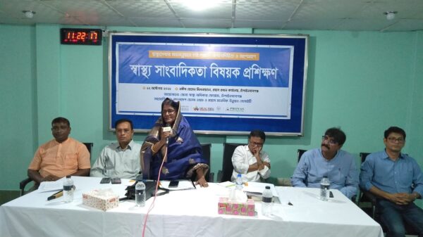 স্বাস্থ্য সাংবাদিকতা বিষয়ে প্রশিক্ষণ কর্মশালা হয়েছে চাঁপাইনবাবগঞ্জে। বুধবার সকালে বাংলাদেশ হেলথ ওয়াচ ও প্রয়াস মানবিক উন্নয়ন সোসাইটির সহযোগিতায় জেলা স্বাস্থ্য অধিকার ফোরামের আয়োজনে প্রশিক্ষণ হয়। ‘স্বাস্থ্য সেবার মানোন্নয়নে চাই স্বচ্ছতা-জবাবদিহিতা ও অংশগ্রহণ’ শ্লোগানে প্রশিক্ষক ছিলেন প্রথম আলো’র স্বাস্থ্য বিষয়ক বিশেষ প্রতিনিধি শিশির মোড়ল। প্রয়াসের নকীব হোসেন মিলনায়তনে অনুষ্ঠিত প্রশিক্ষণের উদ্বোধনী অনুষ্ঠানে সভাপতিত্ব করেন জেলা স্বাস্থ্য অধিকার ফোরামের সভাপতি নবাবগঞ্জ সরকারী কলেজের অব. অধ্যক্ষ প্রফেসর সুলতানা রাজিয়া। স্বাগত বক্তব্য রাখেন জেলা স্বাস্থ্য অধিকার ফোরামের সাধারণ সম্পাদক ও প্রয়াস মানবিক উন্নয়ন সোসাইটির প্রতিষ্ঠাতা ও নির্বাহী পরিচালক হাসিব হোসেন। আরও বক্তব্য রাখেন বাংলাদেশ হেলথ ওয়াচের অ্যাডভোকেসি ও কমিউনিকেশন বিভাগের কো-অর্ডিনেটার মো. রিয়াজ উদ্দিন খান ও প্রোগ্রাম ম্যানেজার মো. মোরশেদ আলম, মিডিয়া কমিউনিকেশন বিভাগের প্রোগ্রাম অফিসার নওশিন মৌলি ওয়ারেসী। অনুষ্ঠান সঞ্চালনা করেন প্রয়াস মানবিক উন্নয়ন সোসাইটির কর্মসূচি ব্যবস্থাপক ফারুক আহমেদ। প্রশিক্ষণকালে শিশির মোড়ল বলেন, স্বাস্থ্য মন্ত্রণালয়সহ ২৩টি মন্ত্রণালয় স্বাস্থ্যের সঙ্গে জড়িত, স্বাস্থ্যসেবা প্রাপ্তির জায়গা কমিউনিটি ক্লিনিক, ইউনিয়ন স্বাস্থ্য কেন্দ্র, উপজেলা ও জেলা হাসপাতাল। আপনারা স্বাস্থ্য নিয়ে রিপোর্ট করার সময় প্রতিষ্ঠানগুলোর সেবা দেয়ার নিয়ম জেনে নেবেন। উল্লেখ্য, বাংলাদেশ হেলথ ওয়াচের সহযোগিতায় প্রয়াস মানবিক উন্নয়ন সোসাইটি চাঁপাইনবাবগঞ্জ জেলায় স্থানীয় পর্যায়ে স্বাস্থ্য অধিকার ও স্বাস্থ্য সেবার মানোন্নয়নে জনসচেতনতা, স্বচ্ছতা, জবাবদিহিতা বৃদ্ধি এবং সকল পর্যায়ে জনঅংশগ্রহণ নিশ্চিত করে স্বাস্থ্যসেবায় টেকসই উন্নয়ন সহায়ক পরিবেশ সৃষ্টি করার লক্ষে জেলা ও নাচোল উপজেলা পর্যায়ে স্বাস্থ্য অধিকার ফোরাম গঠন করে।